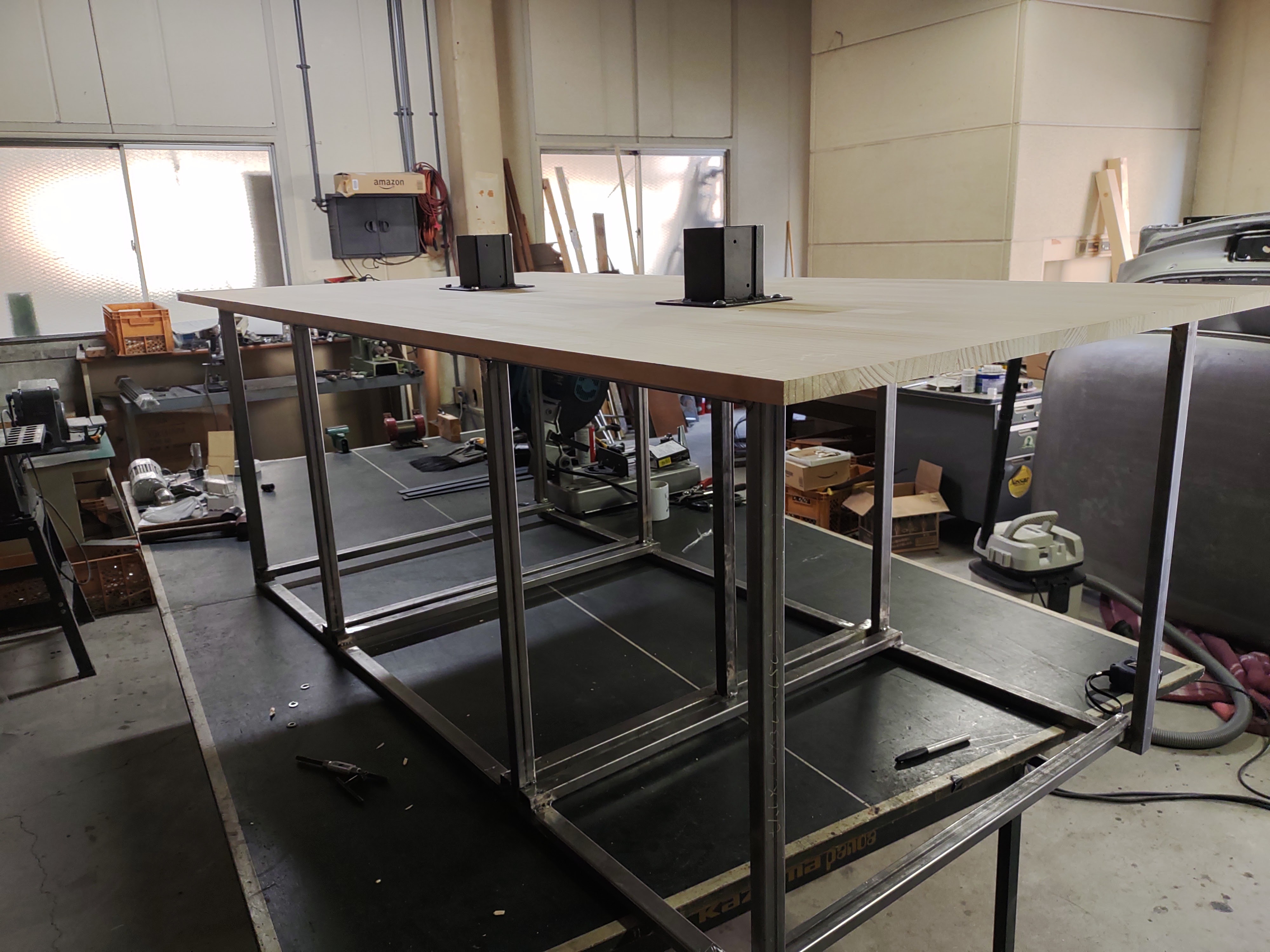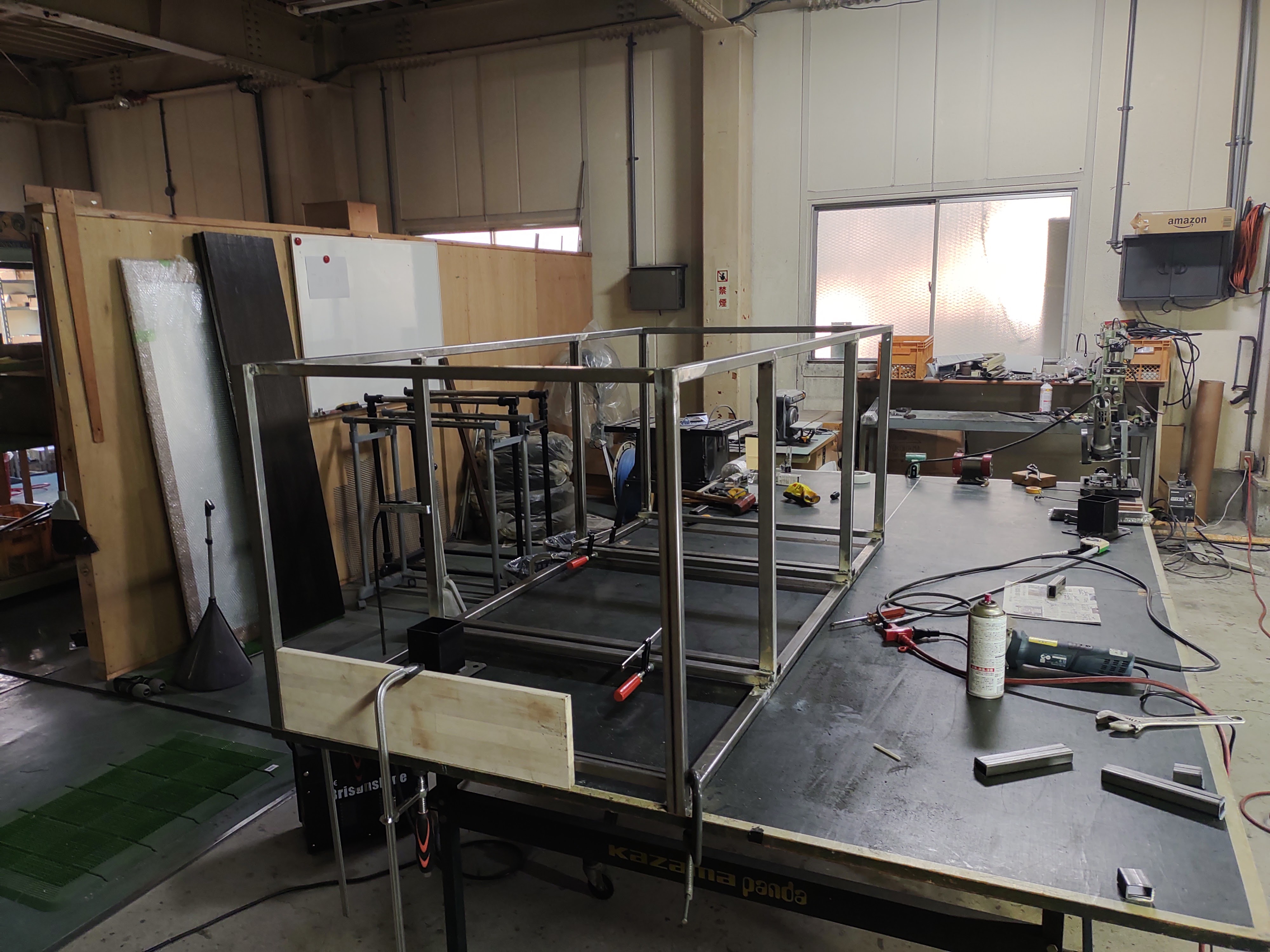 鉄骨を組み、収納スペース!土台!?の製作です。バックヤードが狭いと言うことで、店舗内に在庫の収納スペースを設ける計画です。