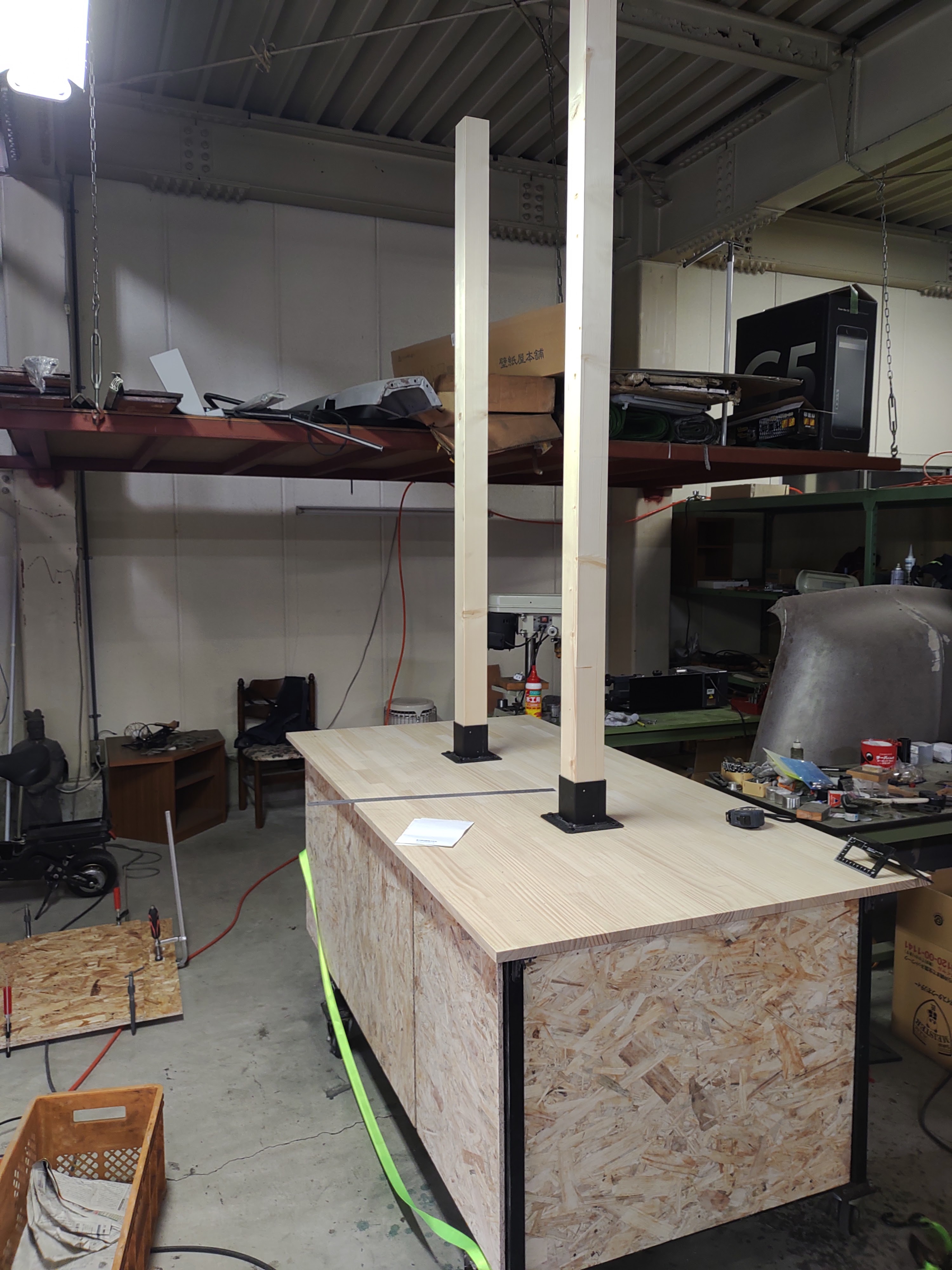 天板を配置!棚を取り付ける柱を2本立てますのでステーを取り付けました。