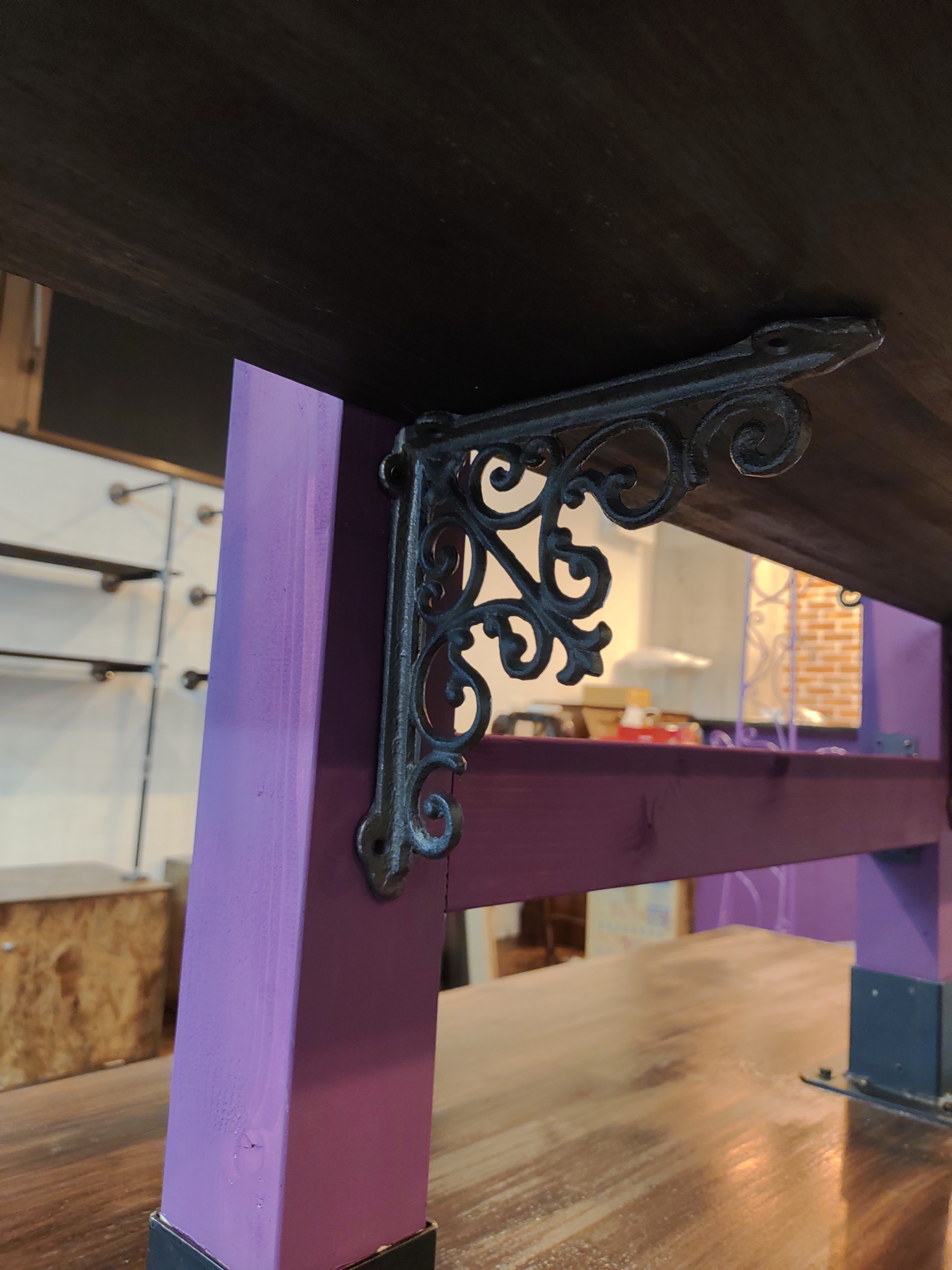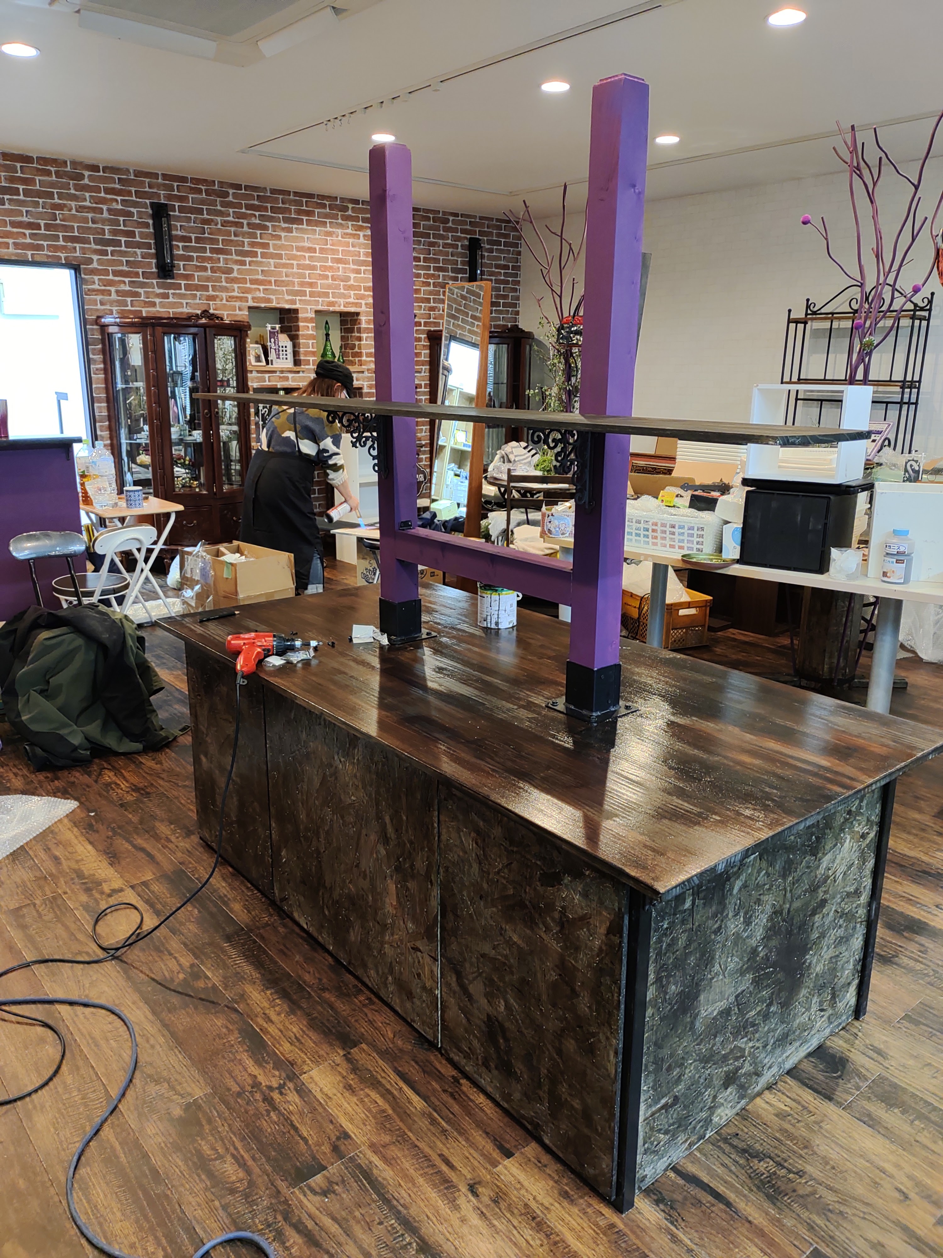 ニスを塗り、支柱をイメージカラーの紫に塗装しました。棚を両サイドへ取り付けま~す。