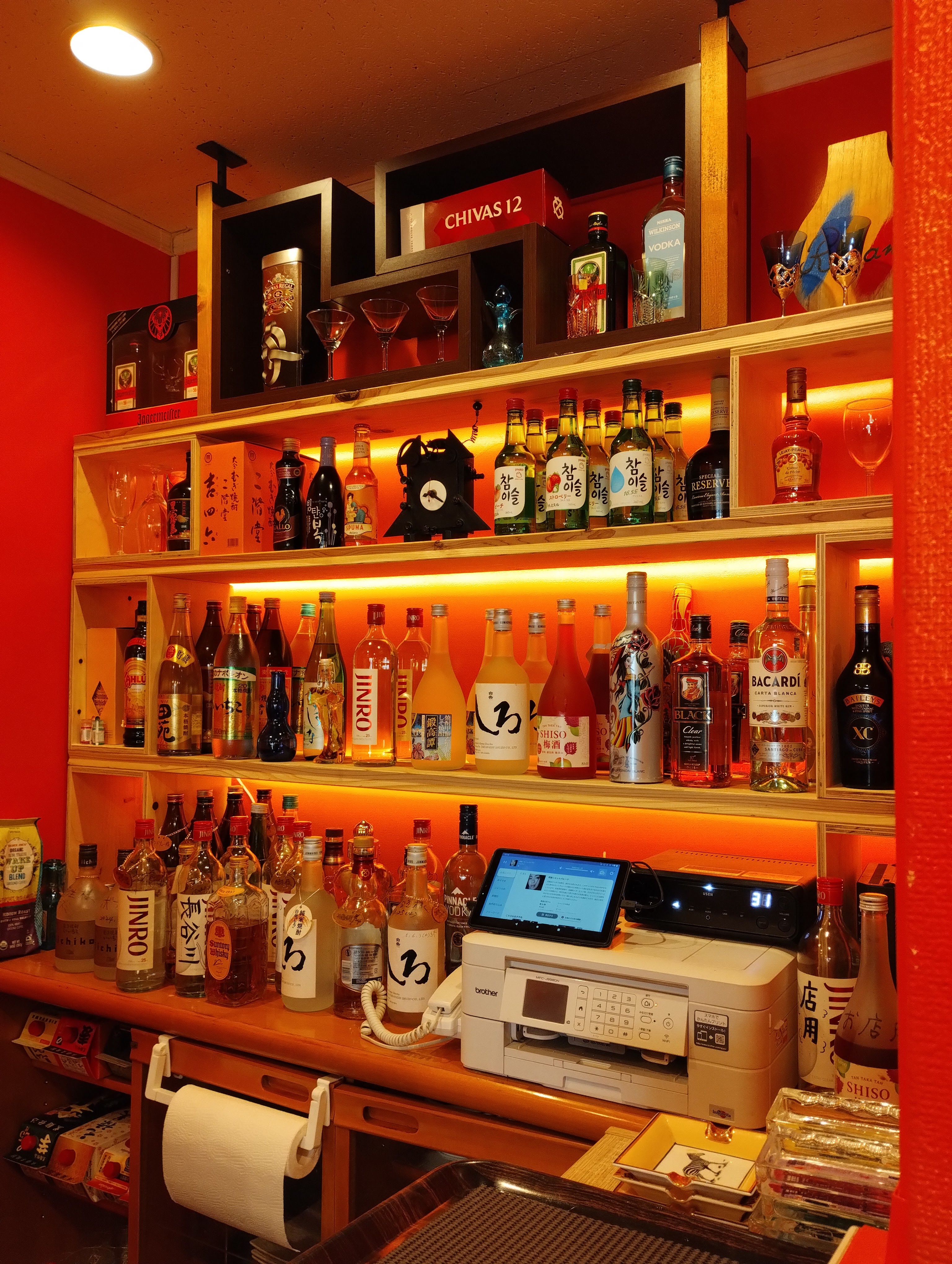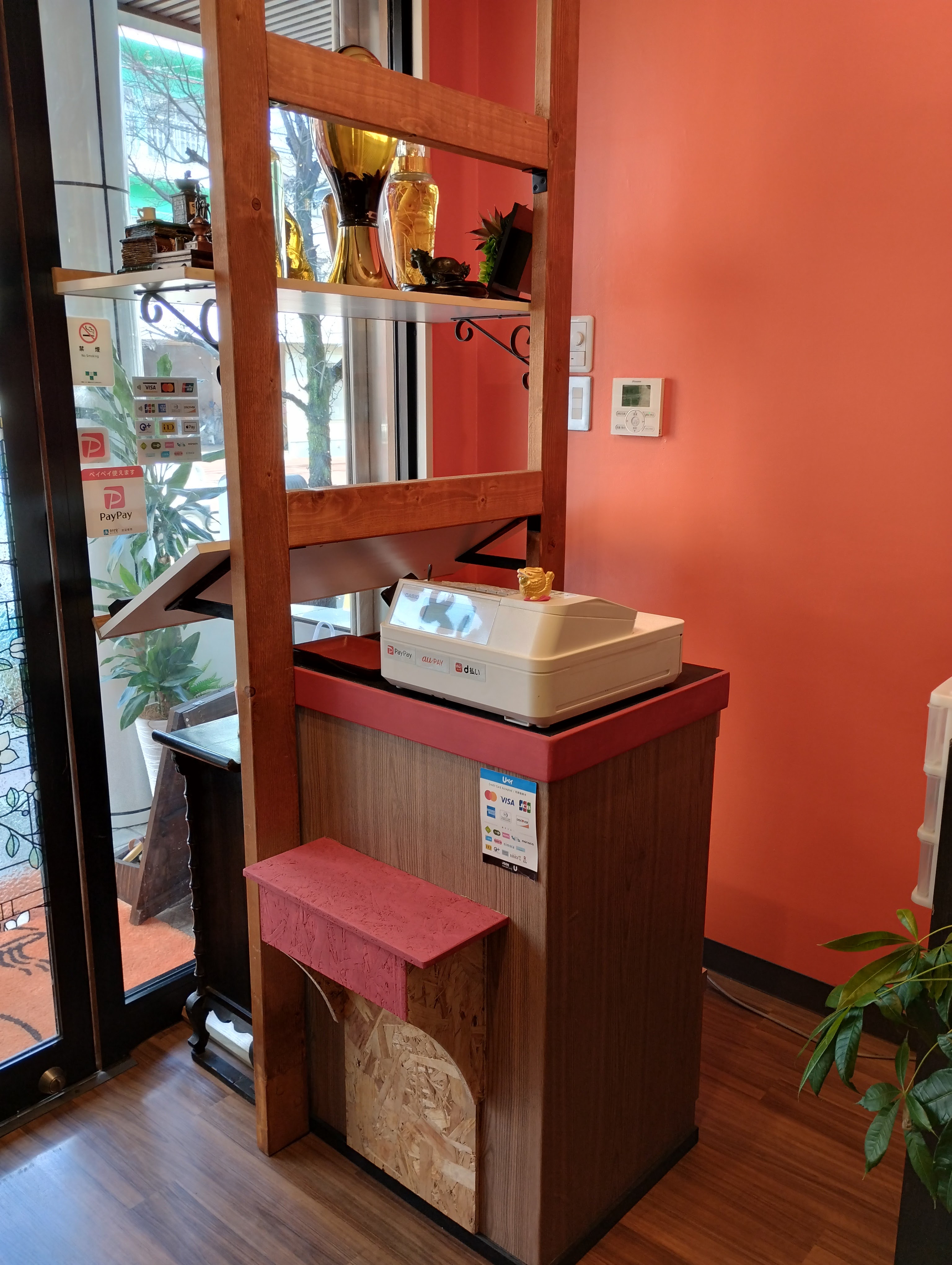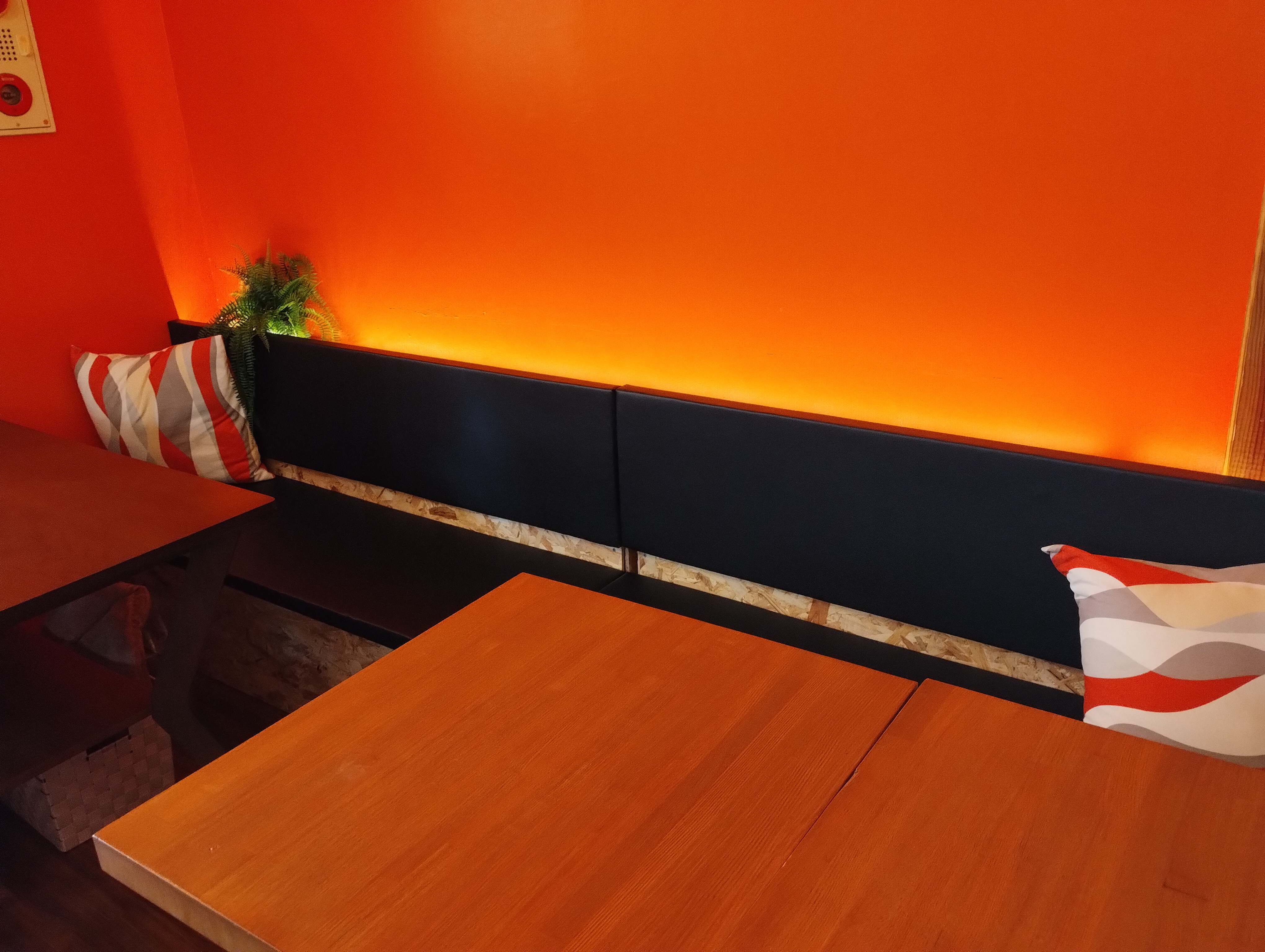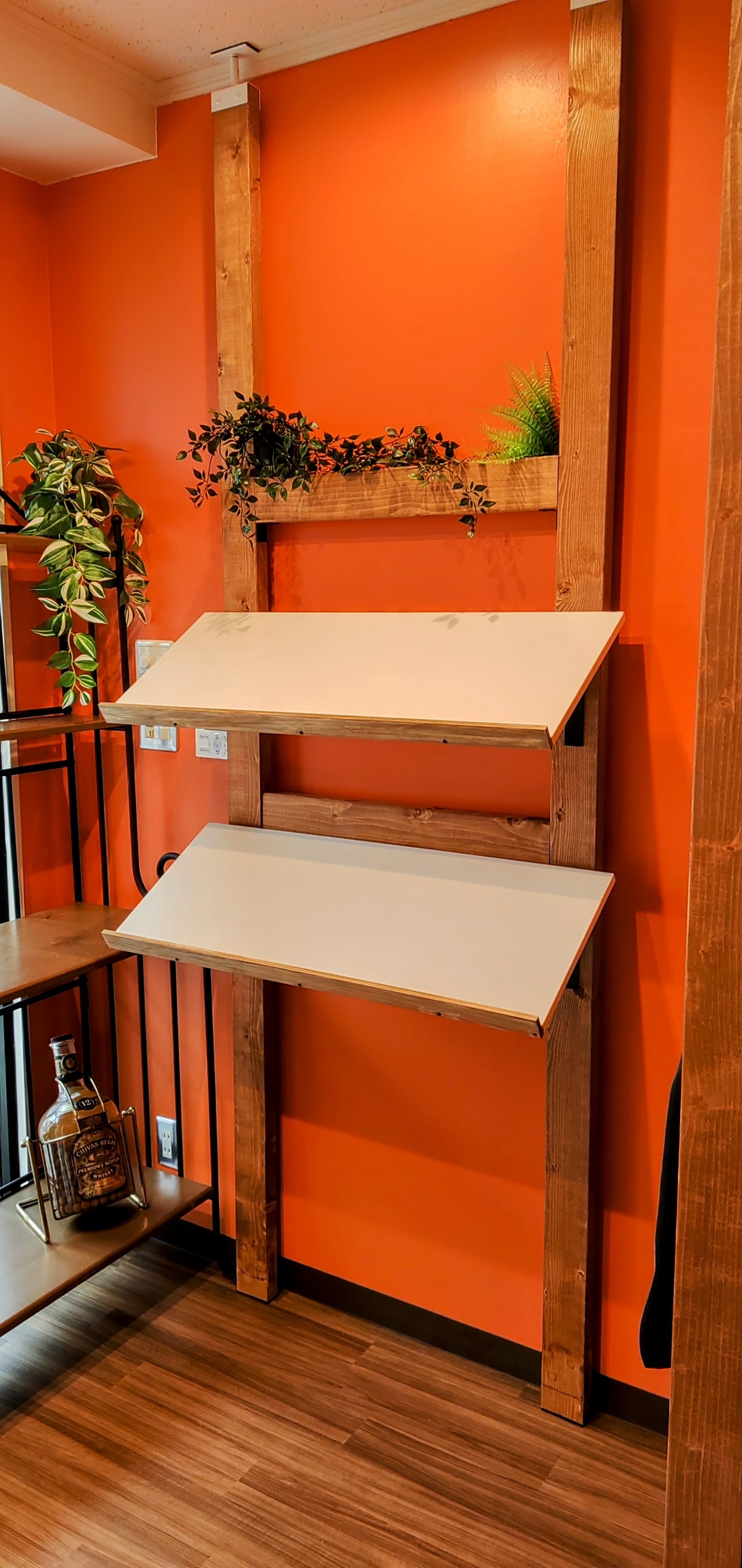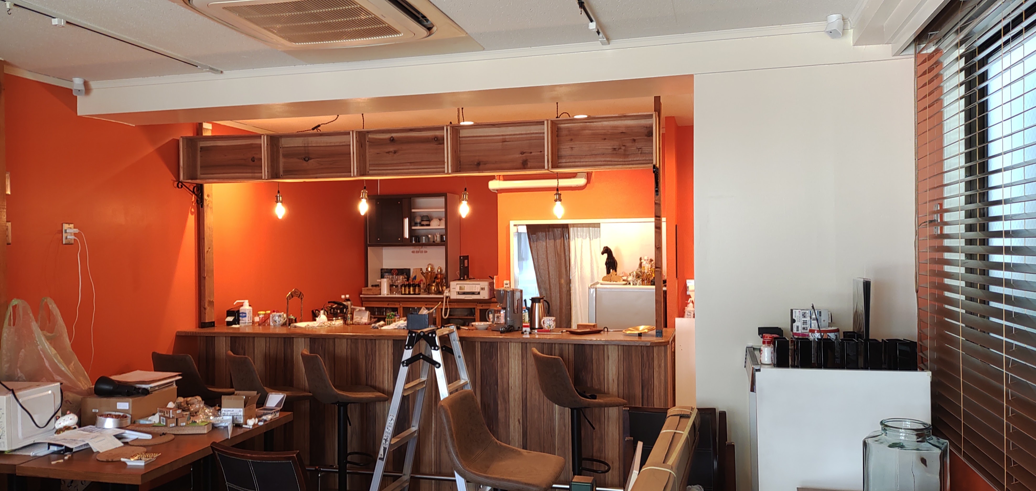 天井には手を付けず、壁はオレンジ色に塗装してもらい、カウンターは壁から一枚ものの集成材となり、広くなりましたね!