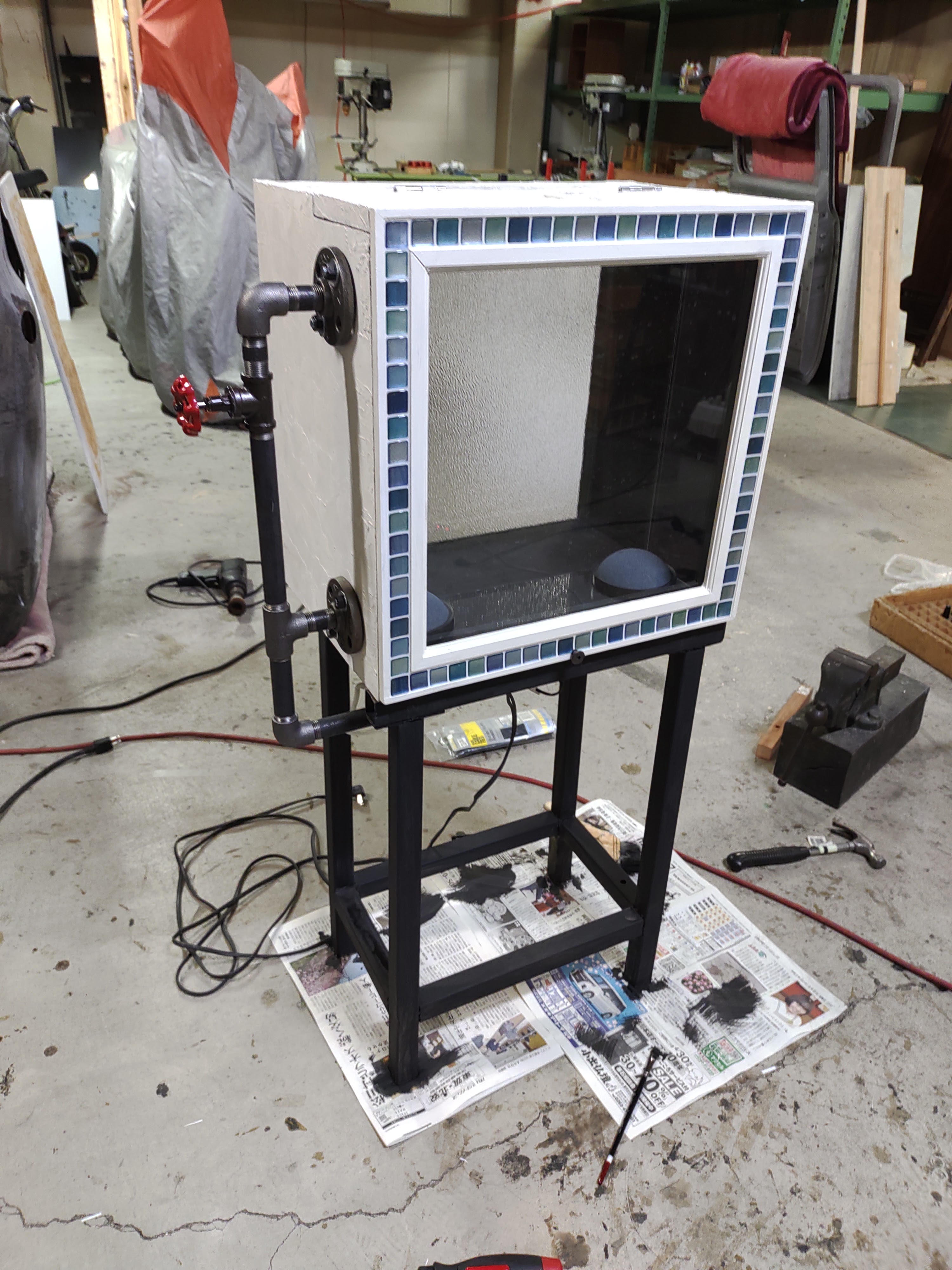 電源が必要なため、水槽らしくバルブと配管でカッコ良くデザインしてみましたよ!