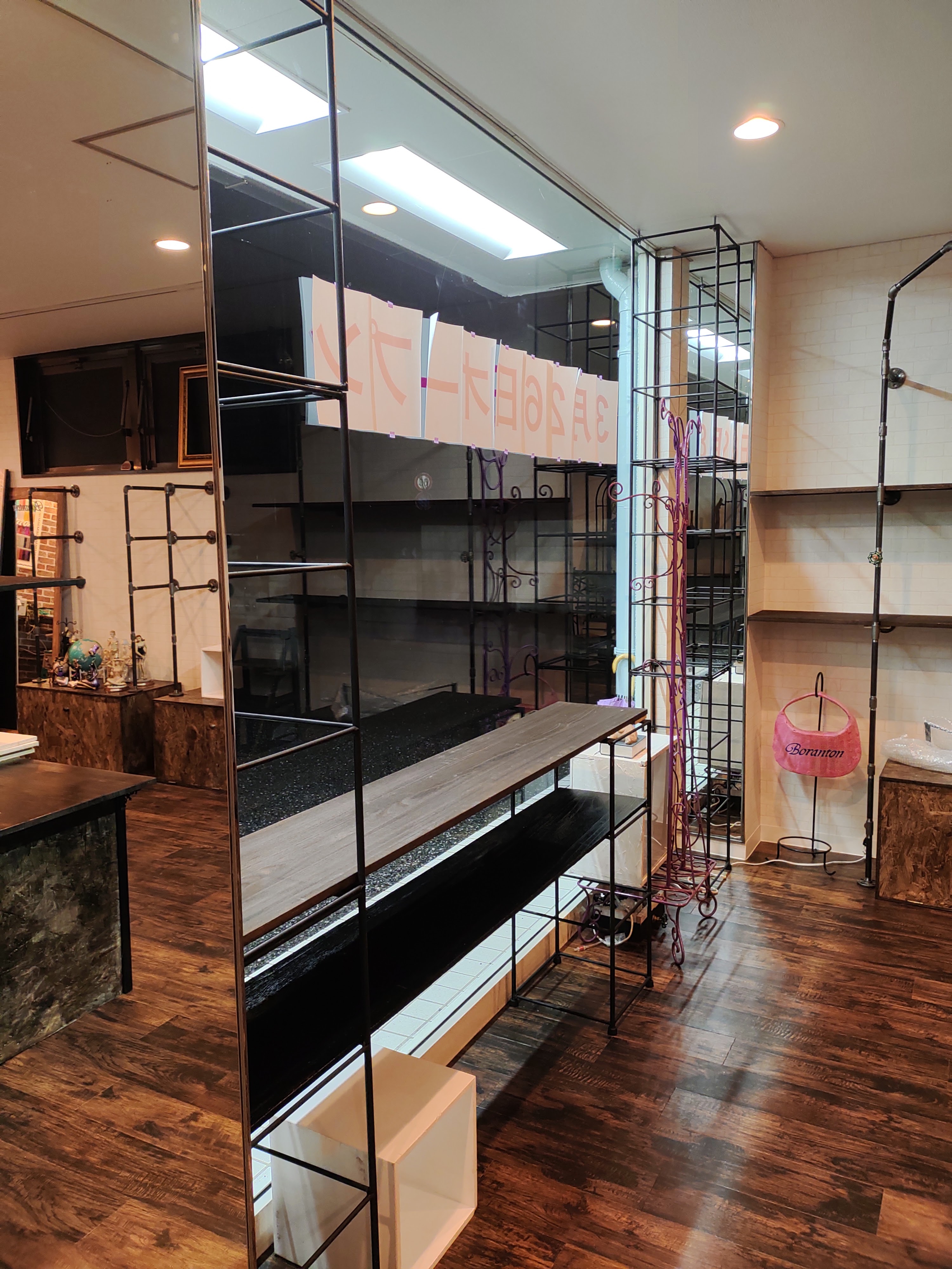 天井にボルト固定で設置完了!ショーウィンドー両端に9段のトラスと中央に3段のトラス1台設置し、焼杉板で棚を設置しました。