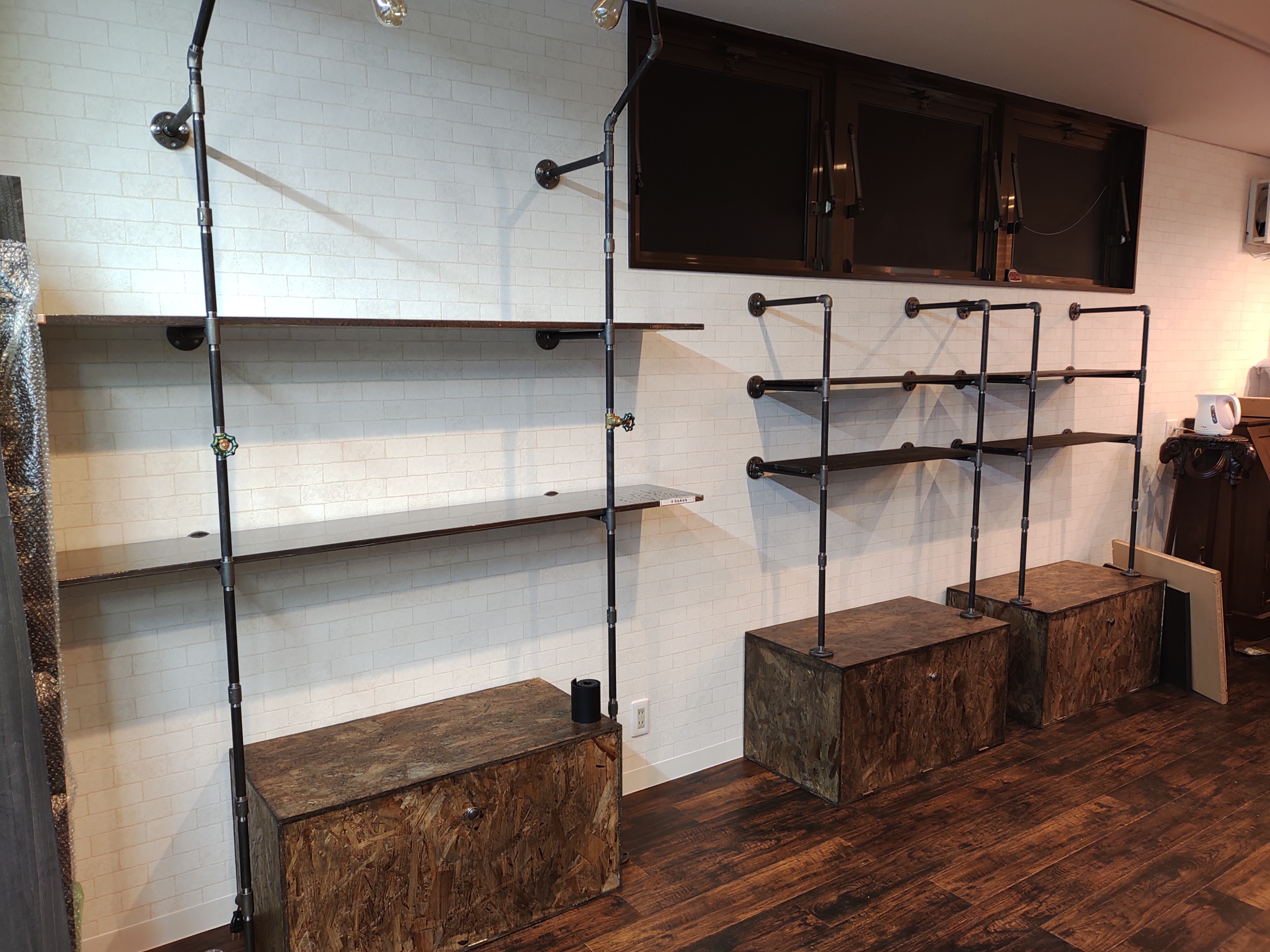 インダストリアル調の配管を利用した展示棚を製作しあした。壁と床にはフランジを利用して固定しています。
