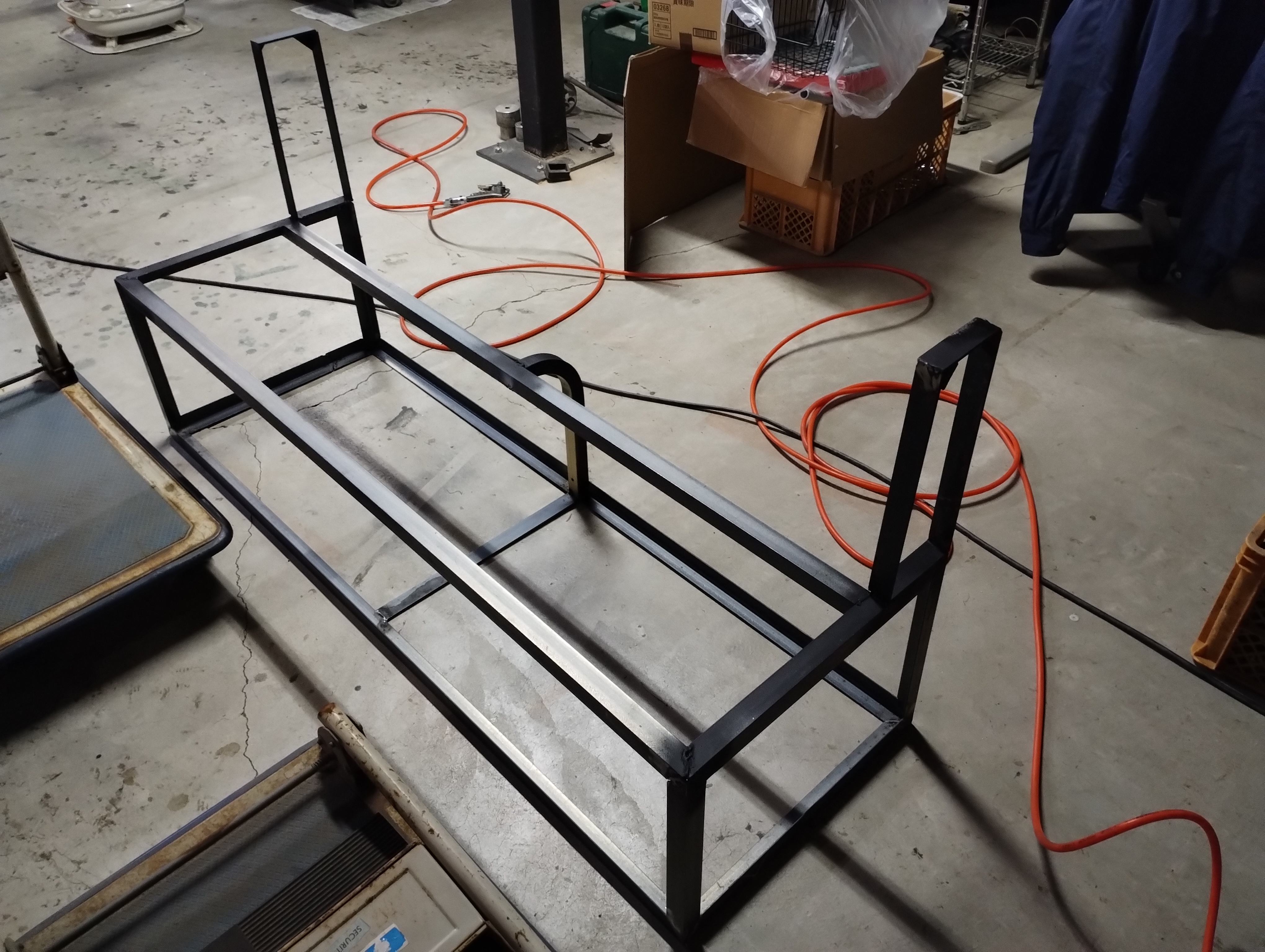 フレームはエル字鋼を使い製作、シートの下がストレージになる構造です。