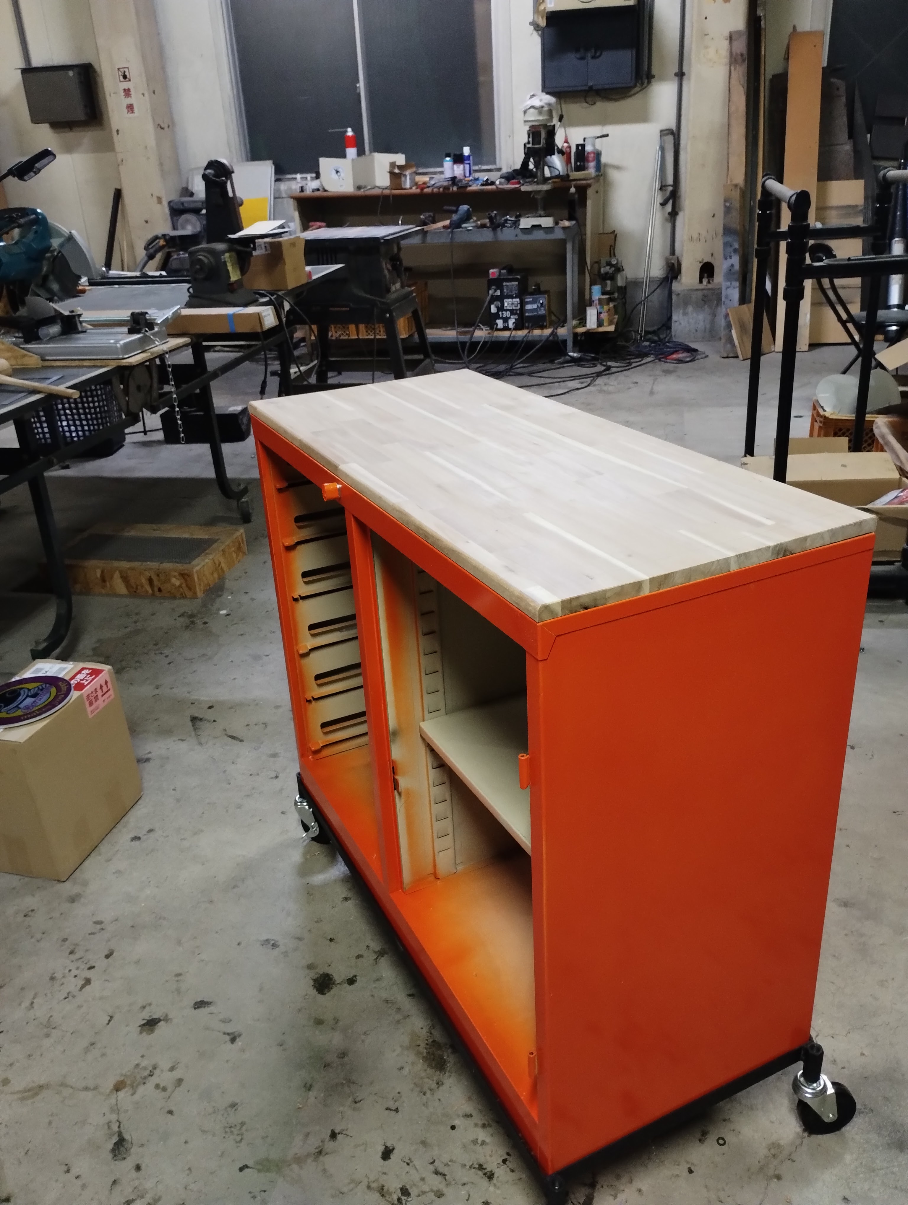 作業用に天板を上部に追加し、ドアや引き出しにOSB合板を貼り付けインテリアにマッチするようにしてみました。