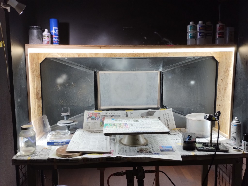 会社で余っていた作業台やプラダンを活用し、家庭用の換気扇を使って塗装ブースを作ったのは6年ほど前の事でしたが、掃除を兼ねてリファインしてみました。