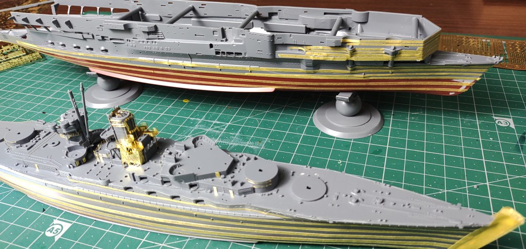 この二艦を同時に製作する事になりました。まず最初に各キットの組立を行いますが、金型の古いキットには「引け」が生じている物が多いのでパテで表面を整えていかなければなりません。