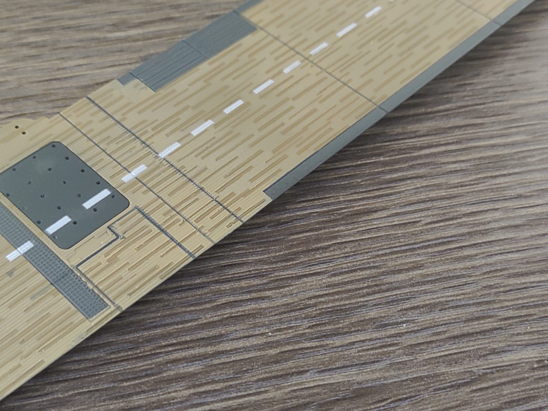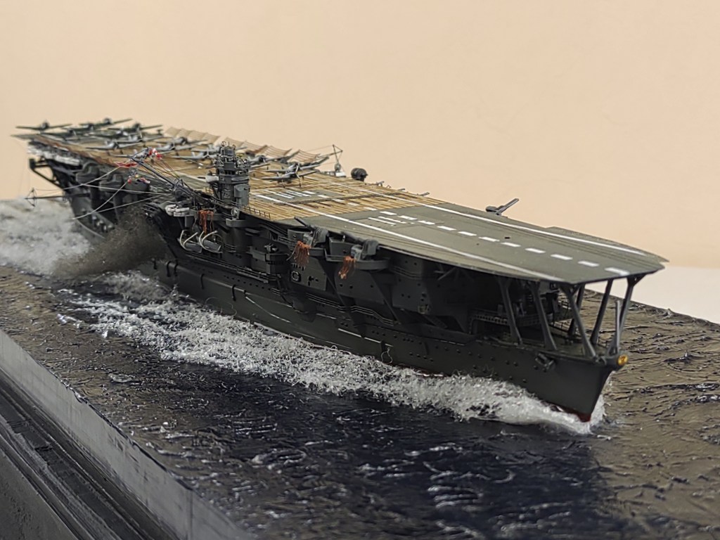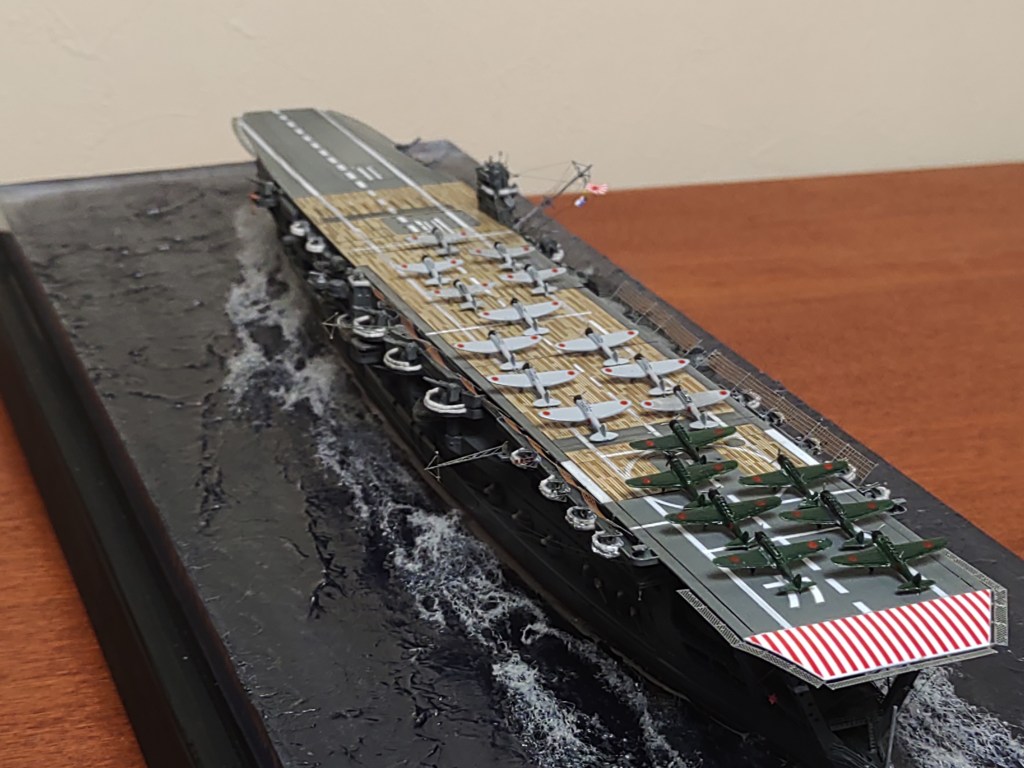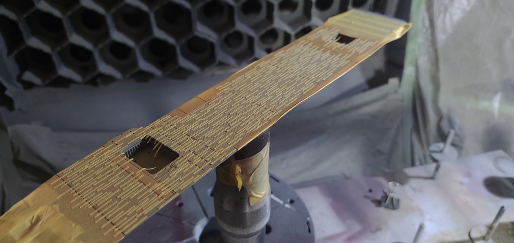 航空母艦の甲板は空母の顔ですので、2色を使い分け木製甲板の雰囲気を演出しました。少し手間の掛かるマスキングですが、3色で塗り重ねた方がより良くなると思います。