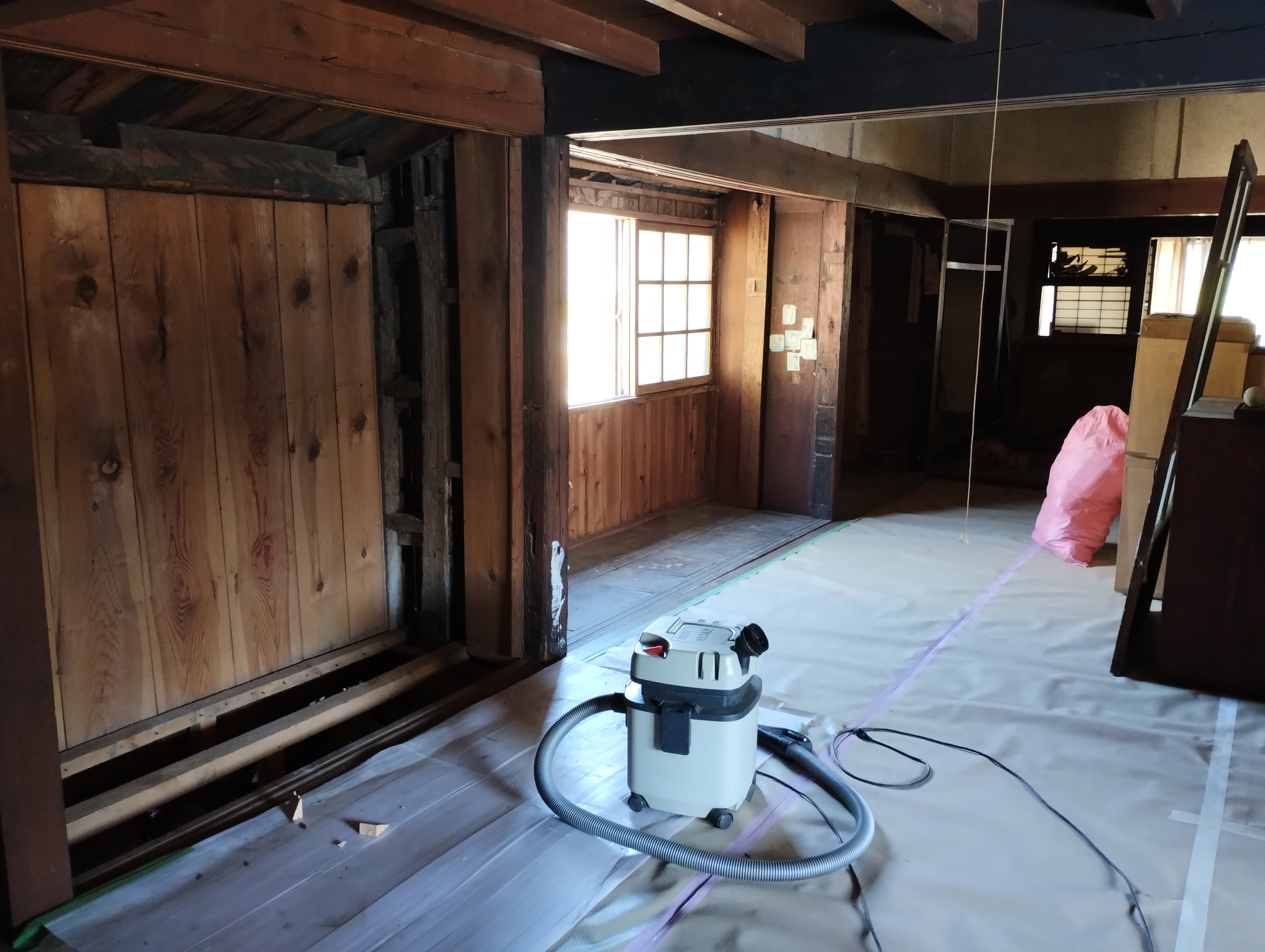 古い床板を捲り、新しく大引きを設置していきます。畳の部屋二つを一部屋にし、フロアリングにします。